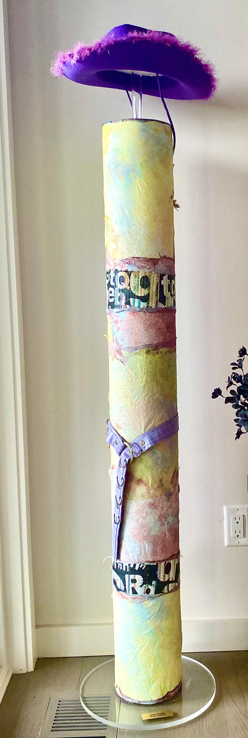Sassy Cowgirl is a bold, attitude-packed art pole that channels western flair with a modern twist. Built around a vintage purple suede hat and an effortlessly cool side-slung leather belt, this mixed media piece captures the spirit of the wild—and the wildly stylish. Perfect for collectors who love fashion-forward art with a wink of rebellion.