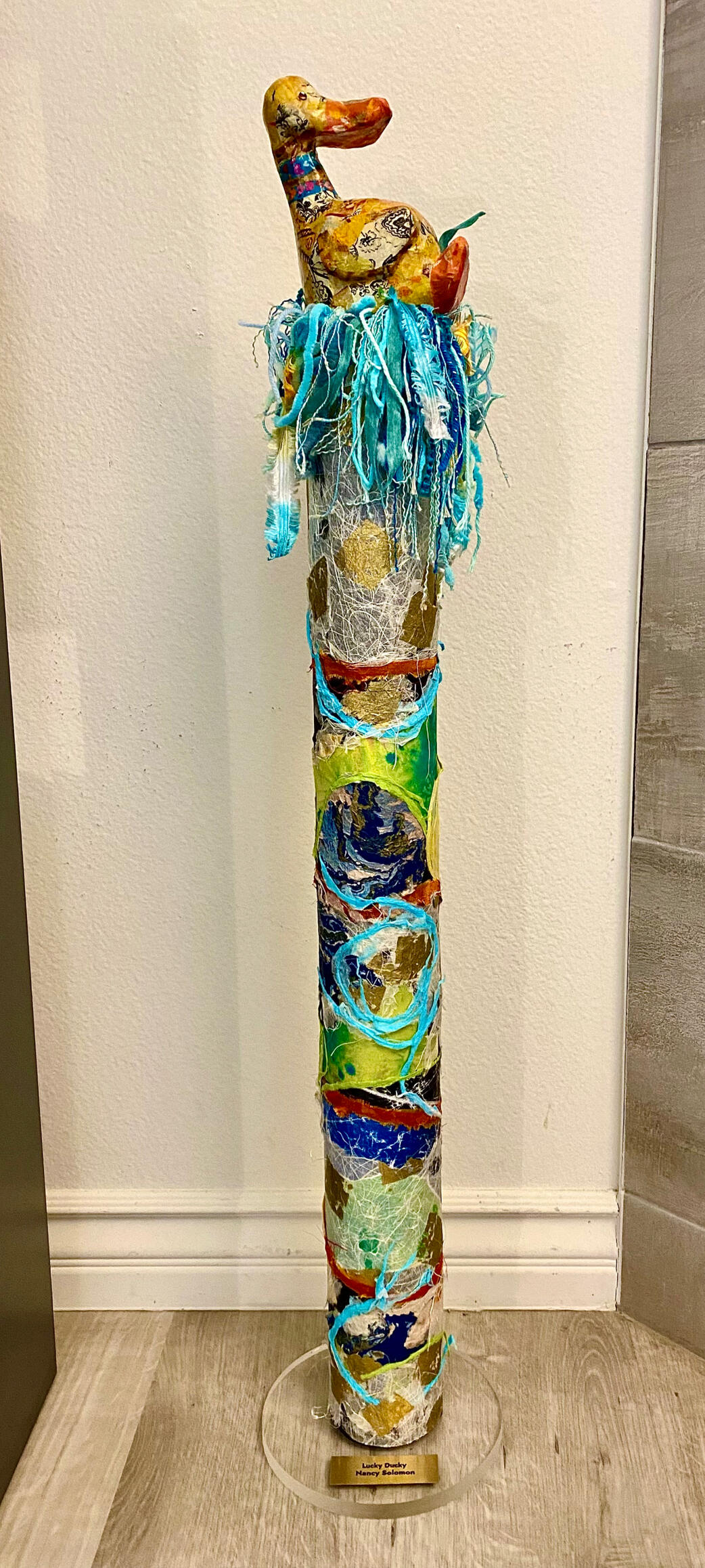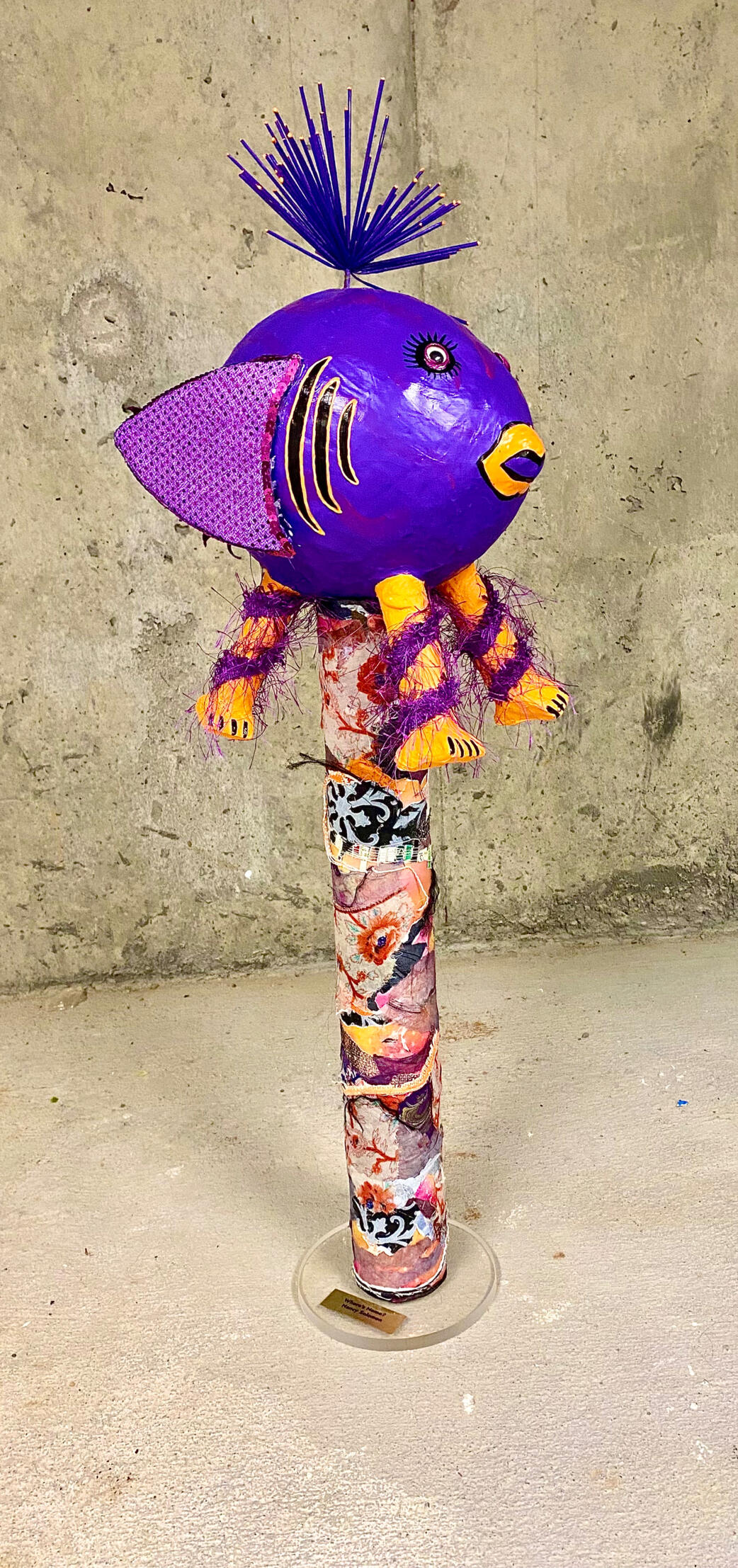 Where’s Nemo? is a whimsical mixed media art pole built around a hilarious, oversized paper mache fish that instantly brings Pixar’s iconic clownfish to mind. Wrapped in vibrant fabrics and layered with playful paper textures, this piece is a bold, joy-filled tribute to humor, nostalgia and imaginative art. A pop of color and personality!