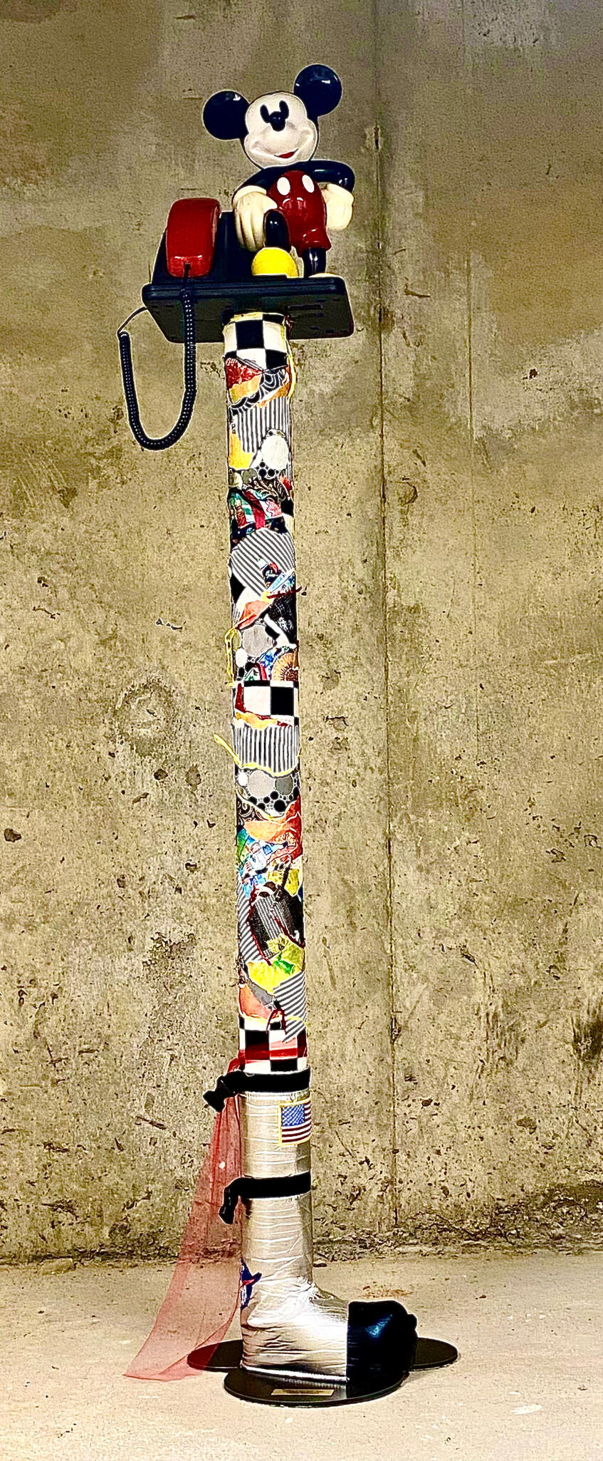 Mickey, It’s for You! is a vibrant mixed media art pole CELEBRATING classic Americana through a playful mash-up of pop culture and space-age nostalgia. Featuring a Mickey Mouse telephone and NASA memorabilia, this one-of-a-kind piece combines whimsy, history, and humor. A perfect conversation starter for collectors who love retro icons, bold design and unexpected artistic juxtapositions.