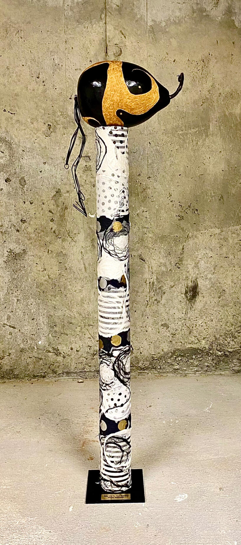 Hello Gourdeous! is a tall, attention-grabbing mixed media pole built around two bold, beautifully shaped gourds. Layered in decorative papers and full of personality, this piece makes a confident, tongue-in-cheek statement—equal parts funky and sophisticated. Ideal for collectors who appreciate upcycled art with flair and humor.