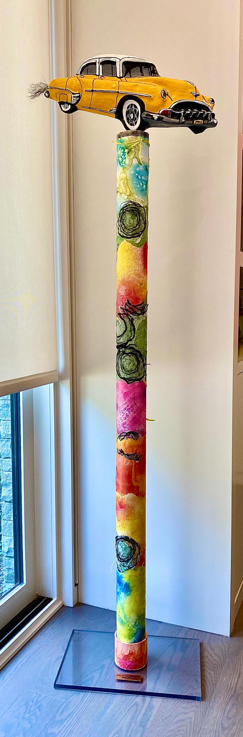 Baby You Can Drive My Car is a joyride of a sculpture—bright, retro, and full of playful nostalgia. Built around a vintage paper mache car and layered in bold decorative papers, this mixed media art pole nods to classic tunes and childhood memories. A perfect piece for music lovers, car enthusiasts and anyone drawn to fun, upbeat art with personality.