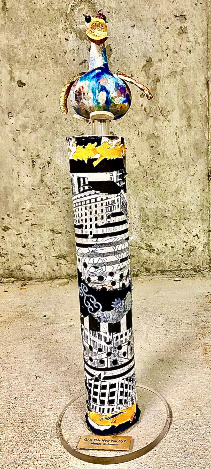 Q: Is This How You Fly? captures a tender moment of curiosity and courage. At the heart of this mixed media art pole is a young bird with an open beak, poised in that beautiful space between dependence and discovery. Wrapped in soft textures and delicate paper, this piece speaks to wonder, growth and the quiet bravery of trying something new.