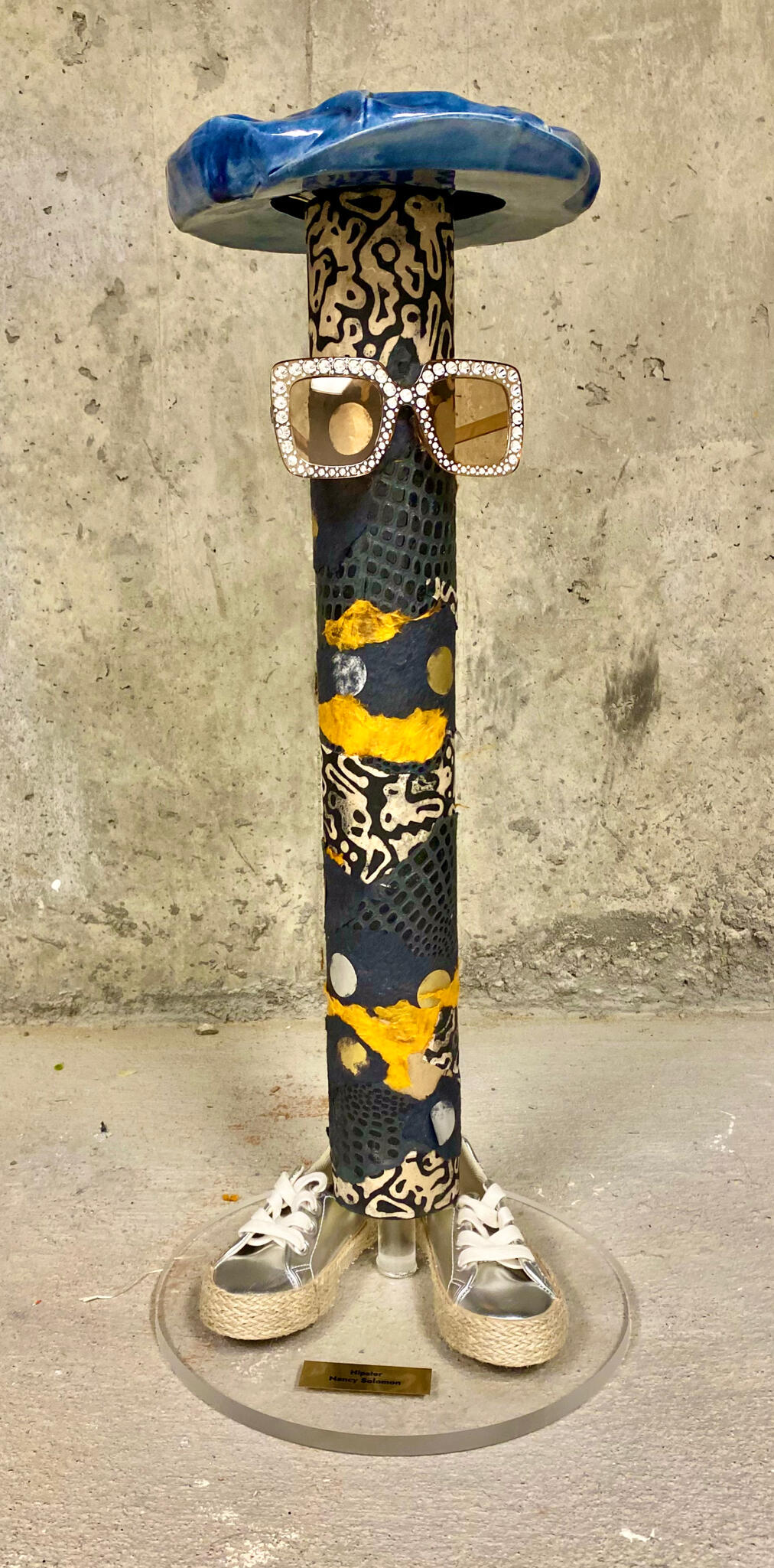 Too Hip is a vibrant mixed media art pole celebrating personality and play. Featuring a fabulously accessorized paper mache hippo (complete with statement glasses), this piece blends humor, whimsy and contemporary design. Ideal for collectors who love bold, joyful sculpture with a story.