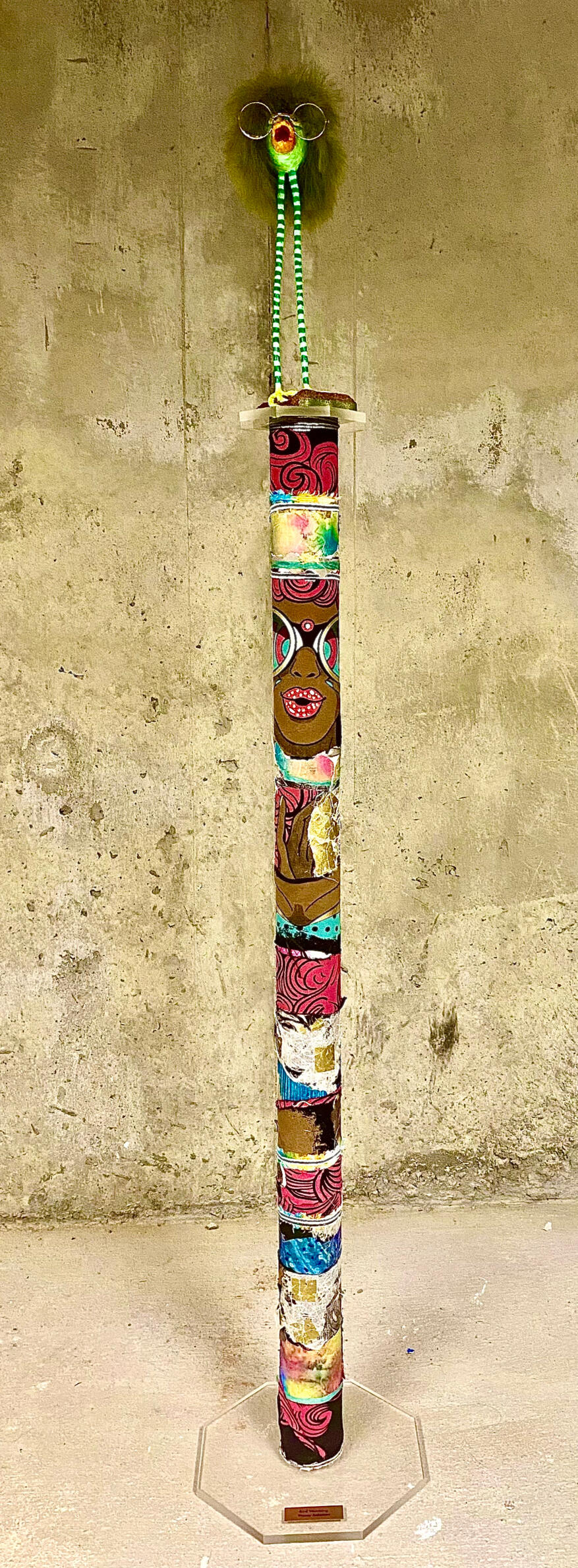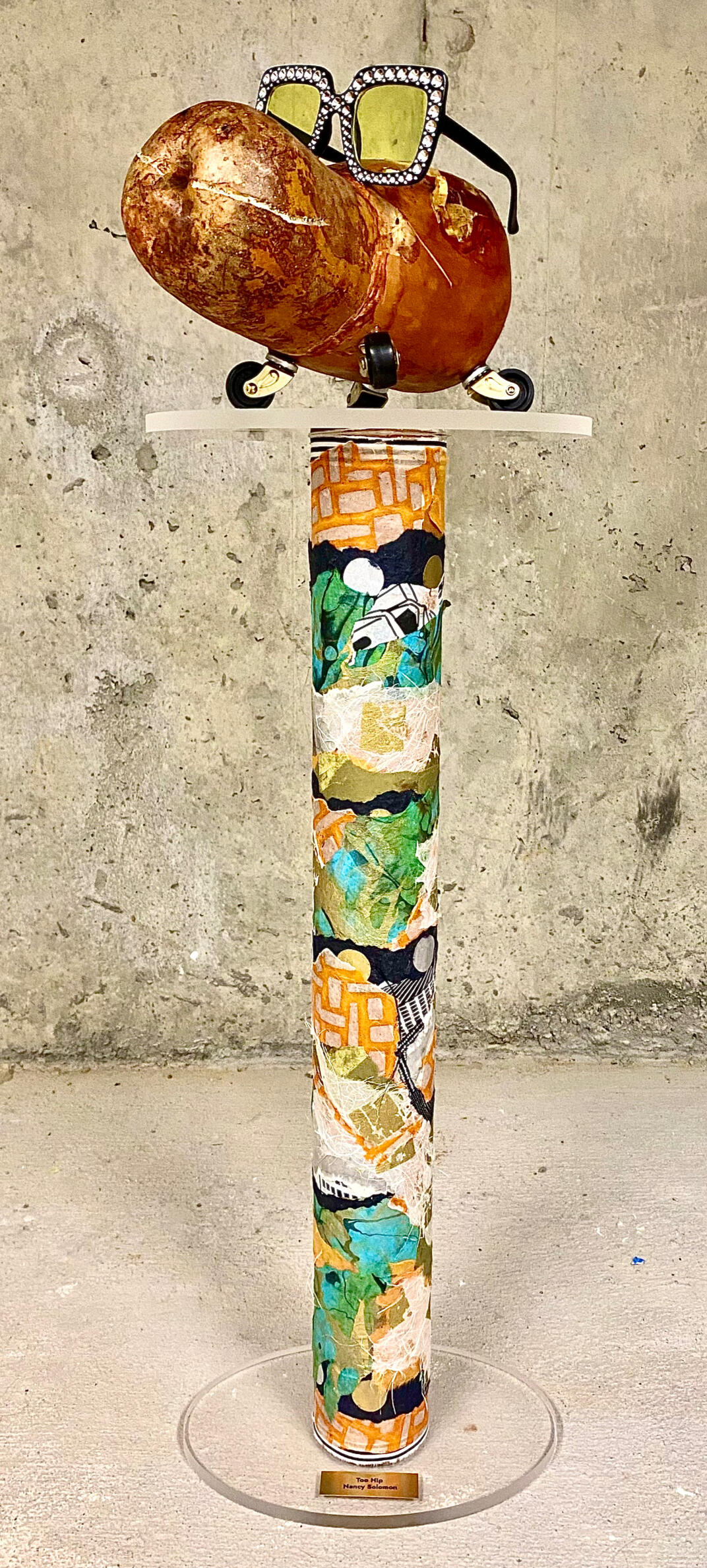 Hipster is a striking mixed media art pole with unmistakable personality. With its stylish stance, layered textures and perfectly placed accessories, this piece channels the spirit of someone who knows they’re cool—and doesn’t need to say a word. A great addition for collectors who appreciate character-rich art, humor and sharp visual storytelling.