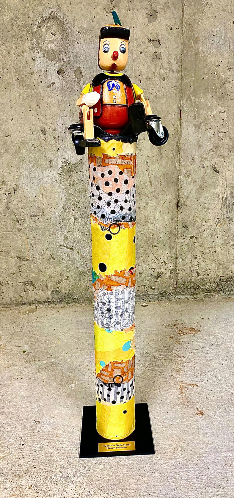 I Lied! I’m Outta Here! is a witty, one-of-a-kind art pole starring a runaway Pinocchio—complete with wheels and an expression that says it all. Blending nostalgic storytelling with bold decorative design, this mixed media piece is perfect for collectors who love playful sculpture, repurposed materials and a dash of mischief in their art.