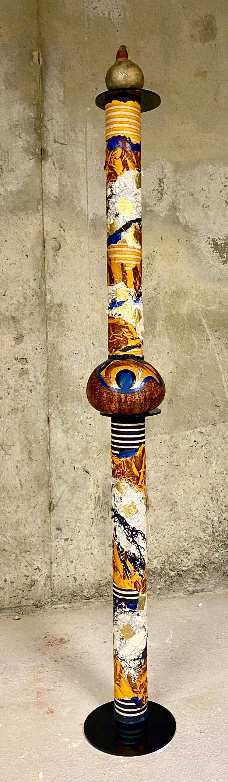 Hello Gourdeous! is a tall, attention-grabbing mixed media pole built around two bold, beautifully shaped gourds. Layered in decorative papers and full of personality, this piece makes a confident, tongue-in-cheek statement—equal parts funky and sophisticated. Ideal for collectors who appreciate upcycled art with flair and humor.
